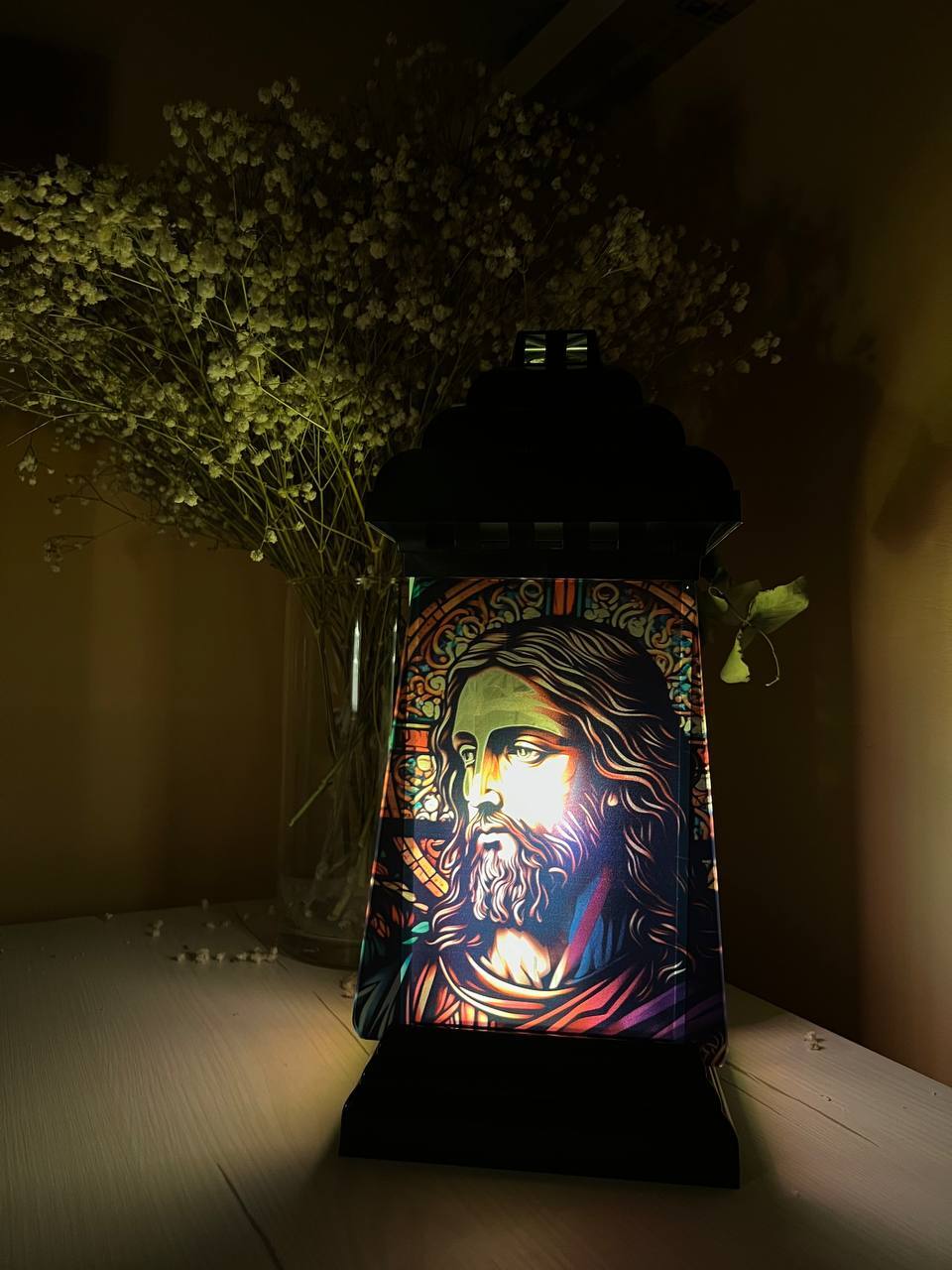 Внутрішнє LED-світло 💡 створює ефект мерехтливого полум’я 🔥, що дарує атмосферу спокою, молитви та тепла 🕊️. Завдяки дзеркальним боковинам, зображення виглядає глибшим і яскравішим